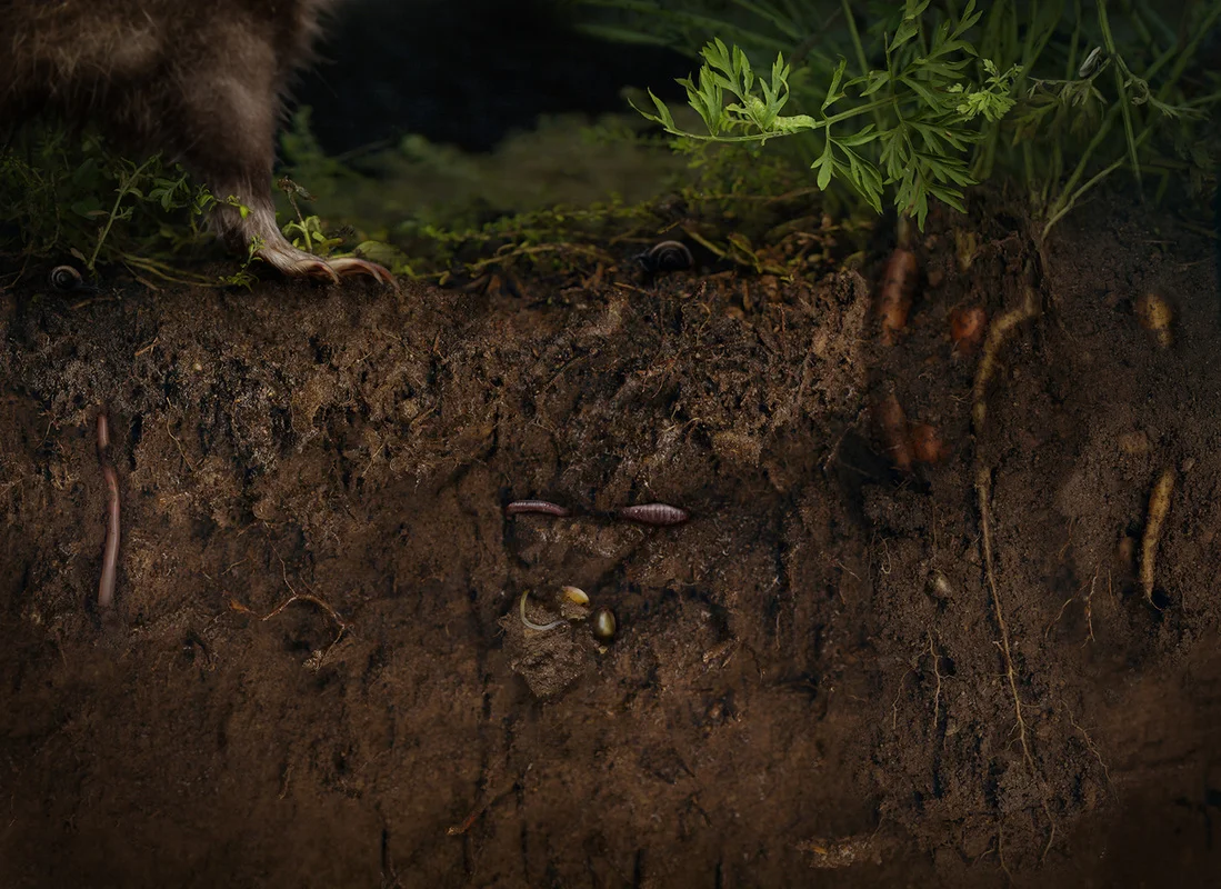 I used the scanner for several reasons. I felt like it invited play at first, allowing experimentation - which are the roots anyway with the work. Digging in the dirt is a huge pastime in our family, finding worms, planting seeds, burying toys/treasure, so I needed a tool that would let me stay in that playful headspace. The enormous resolution provided detail that I just can’t get with a lens. Aesthetically, there is a lot of mystery that goes with the super shallow depth of field that is unique to the scanner. I didn’t want the work ever to answer any questions about what is happening underground, however to underscore that much is happening underground. The high resolution in the areas that are in focus has always felt surreal and bizarre to me, then it quickly goes out of focus due to the scanner’s shallow depth of field. I wanted that heightened information coupled with the soft hints of what was happening to push the mysterious narrative of tableau. The aesthetics of the scanned image emphasized the idea that I wanted to come across.