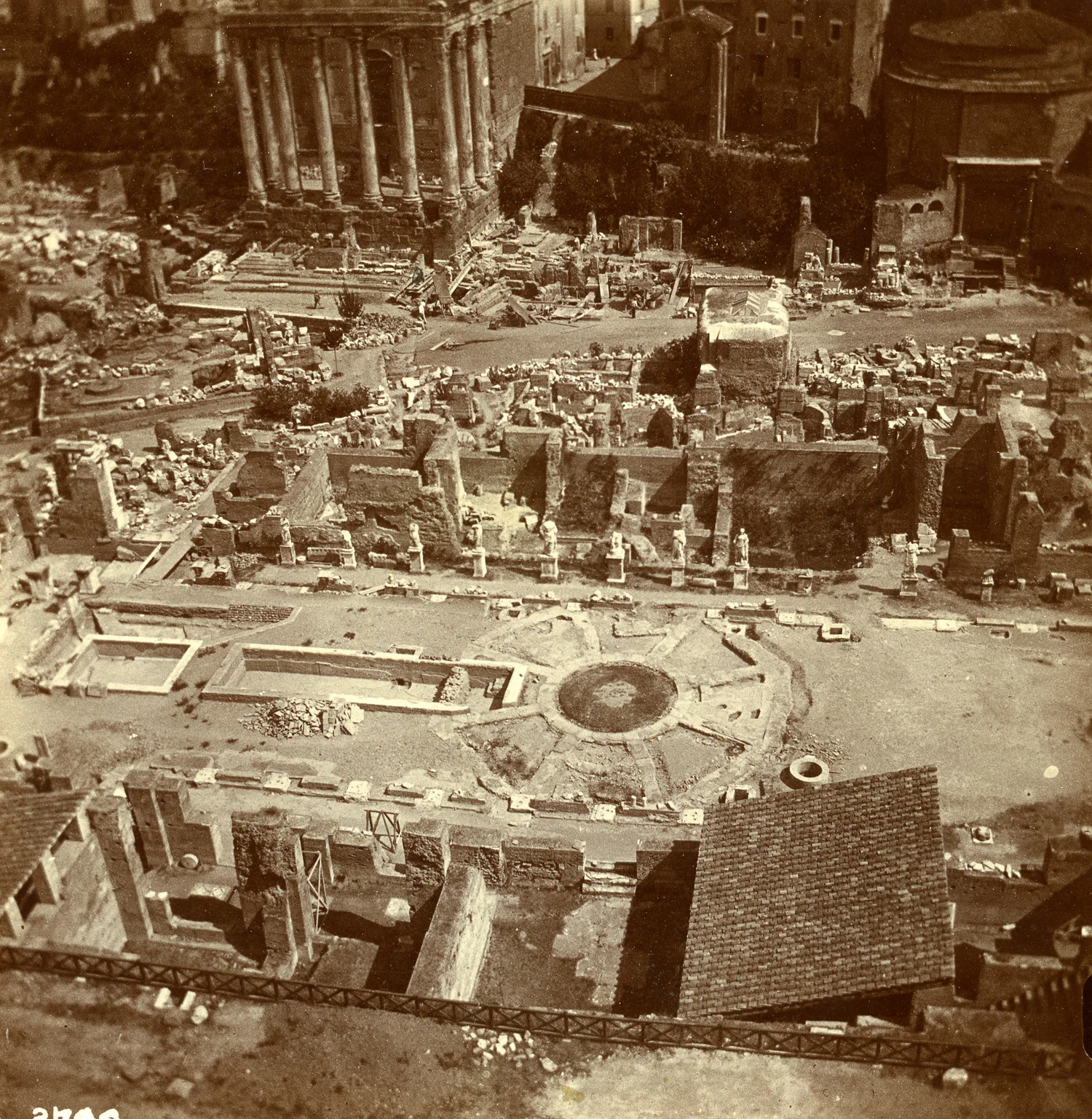 Esther Boise Van Deman’s row of photographs, on the surface, represents the more clinical and scientific view of Rome. Her black and white albumen prints measure barely four by four inches, provoking an appropriately scientific response that nearly evokes looking through a microscope. Van Deman, an archeologist by training, made several trips to Rome to participate in digs and recovering of ancient sites and monuments; as a result, her photographs are mostly architectural shots with very little obvious human presence. However, this collection of photographs covers Van Deman’s visits from the early 1900s until 1925, and as such, does provide opportunities for a developing narrative to occur regarding what she chooses to document and commemorate.