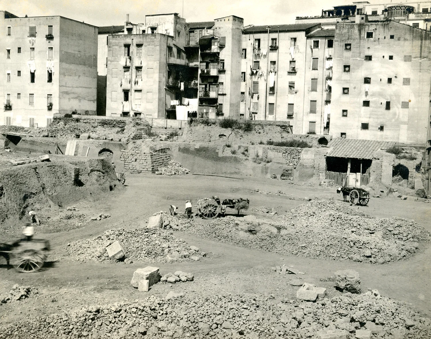 Three of the last four works in Van Deman’s section, taken in the later years, do feature people in addition to their evidence and artifacts. In a particularly charming pairing, Viminal Hill is shown in two side-by-side photos—one of the excavation of the dig site, and one of a family standing in the shade on the same hill. In the first image, the only living force is the tiny grain-sized humans working in the center, as well as their pack animals lugging around wagons; it’s a literal pit, an absence created in Rome’s ground and foundations to find what remains of the people who lived there thousands of years ago. Viewed alongside the photograph of the contemporary family, who is very much alive, we can think of this dialogue as hinting at a change in how Van Deman came to conceptualize her work: the image of the family reminds us—and her—of the very real human lives being studied and sought after in the excavation depicted in the previous photograph.