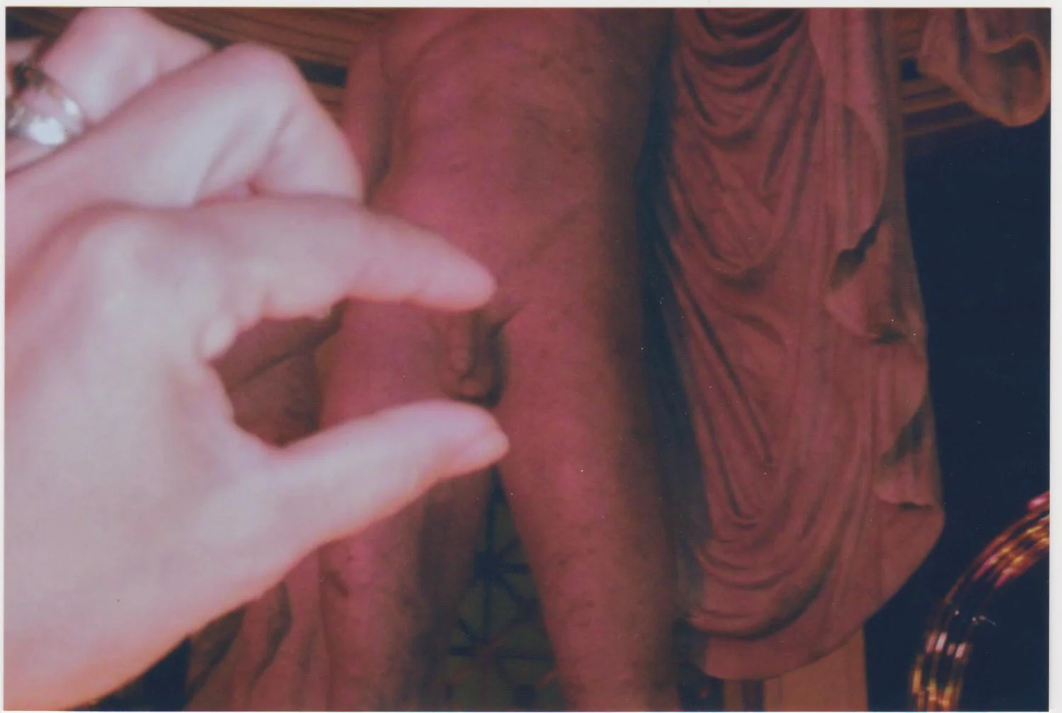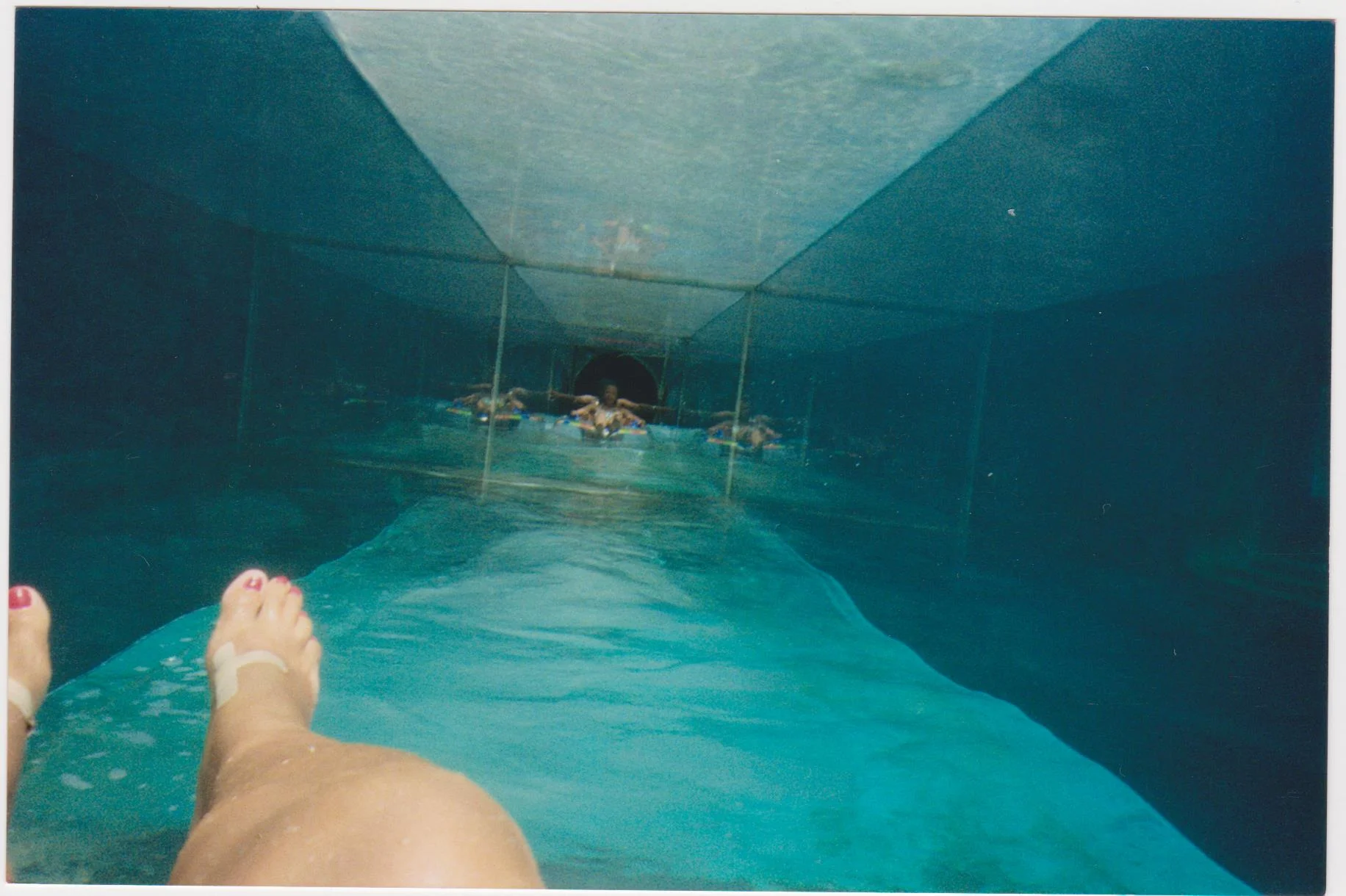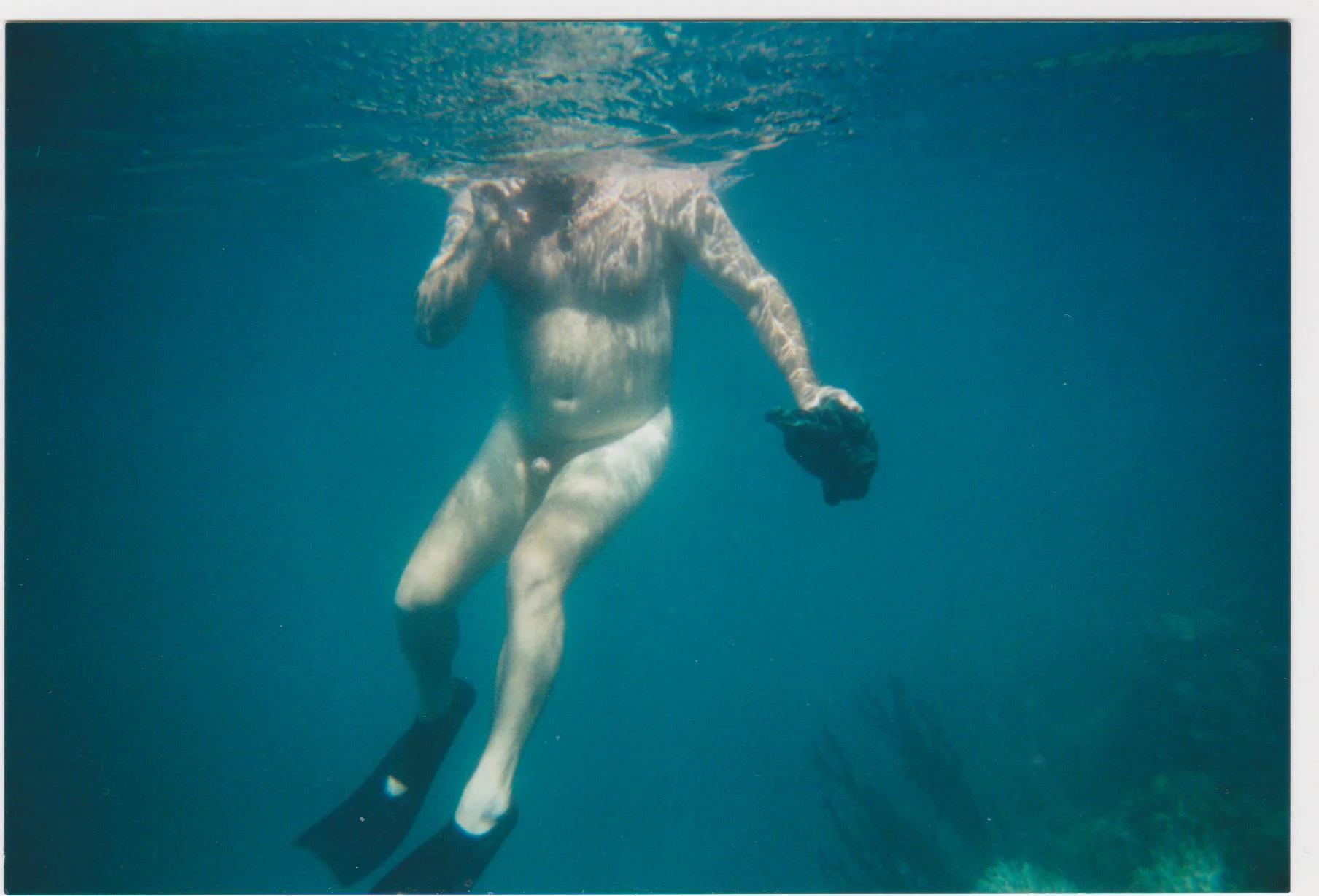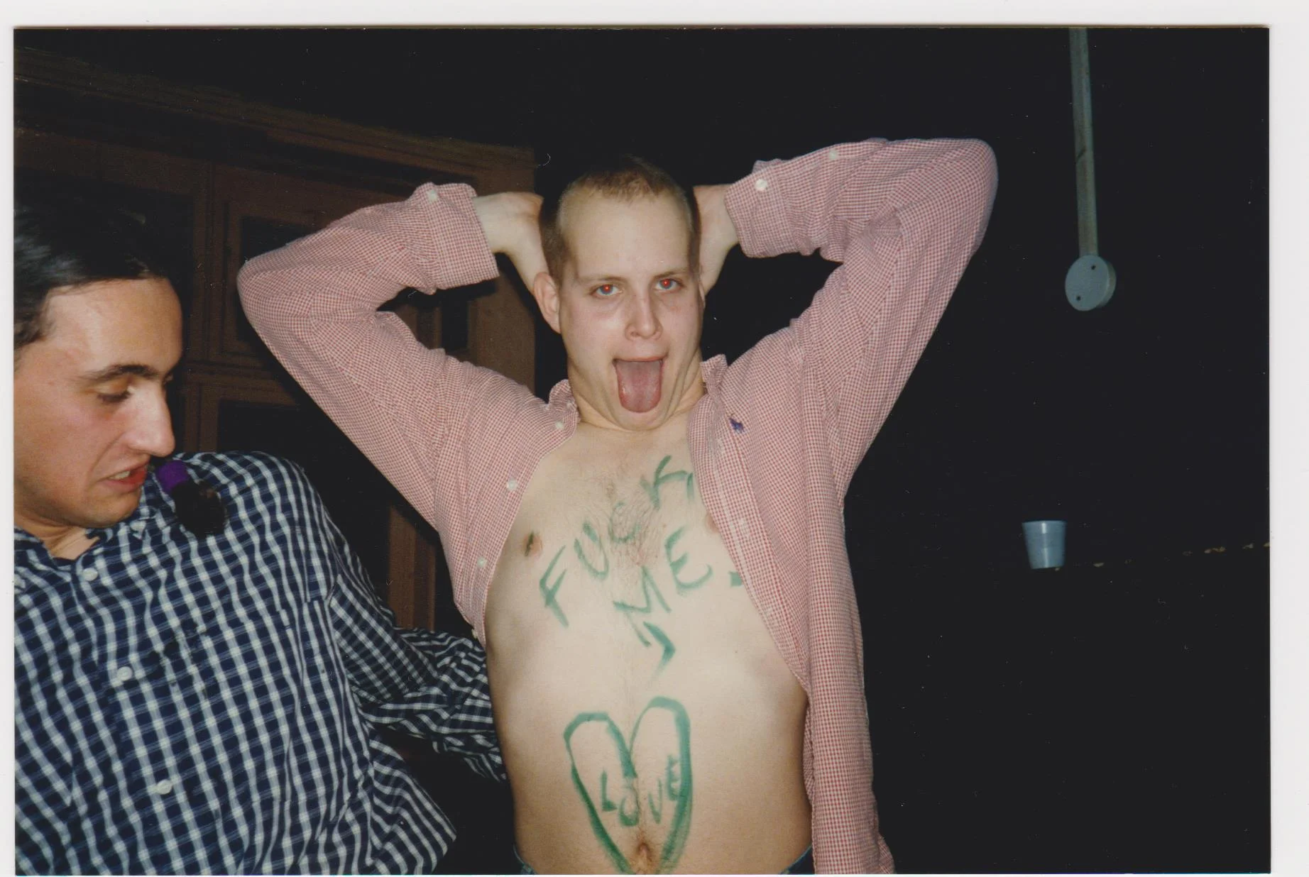In one photograph taken at close range, for example, a woman holds her lips open to show her new grills. Her face is blurry, the camera’s lens likely auto-focused to a Ford Focus car in the background. In another photograph, a man in his early twenties stretches his arms behind his head, tongue sticking out, his unbuttoned shirt revealing the words ‘fuck me’ on his chest in green magic marker above a similarly scribbled heart. Maybe he's at a bachelor or a fraternity party. More likely than not, he's wasted, and enjoying it. Another photo is shot in first-person as a woman slides down a waterslide. Her leg juts into the foreground, toes painted, a couple bandages cover some blisters on her feet. The rest of the frame is filled with grainy turquoise and other fellow watersliders in the background. Another image, taken from just below the water's surface, shows a man's body, neck-down, fully unclothed save for some flippers on his feet. In Jackson's mind, these images and others suggest an evolved kind of freedom and casual relationship to the camera and its use to document everyday joys.
