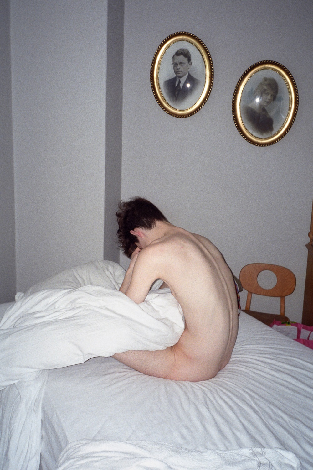 Anokhina’s display 25 Weeks of Winter has a mysterious narrative quality; her works actually take up one smaller wall and the remaining wall of the gallery, linking the two through one photograph laid on the ground in the corner to tell a melancholy, “heartsick” story from left to right. The bedroom interior of the stark color photograph in the corner is repeated in a black-and-white image on the first, smaller wall, allowing the viewer to ponder on the theme of heartsickness and loneliness: the black-and-white image has two subjects in bed, while the color photograph depicts a naked single figure bent over in clear discomfort. Once this room held life and connection and love, but no longer. The remaining works on the larger wall further this motif of loneliness, even dipping into images of desolation: the most rightward of the photographs are snapshots of a room in apparent disarray, with a broken chair, torn color tape, and broken bottles of liquor: once again, the place that held joy and happiness is empty.
