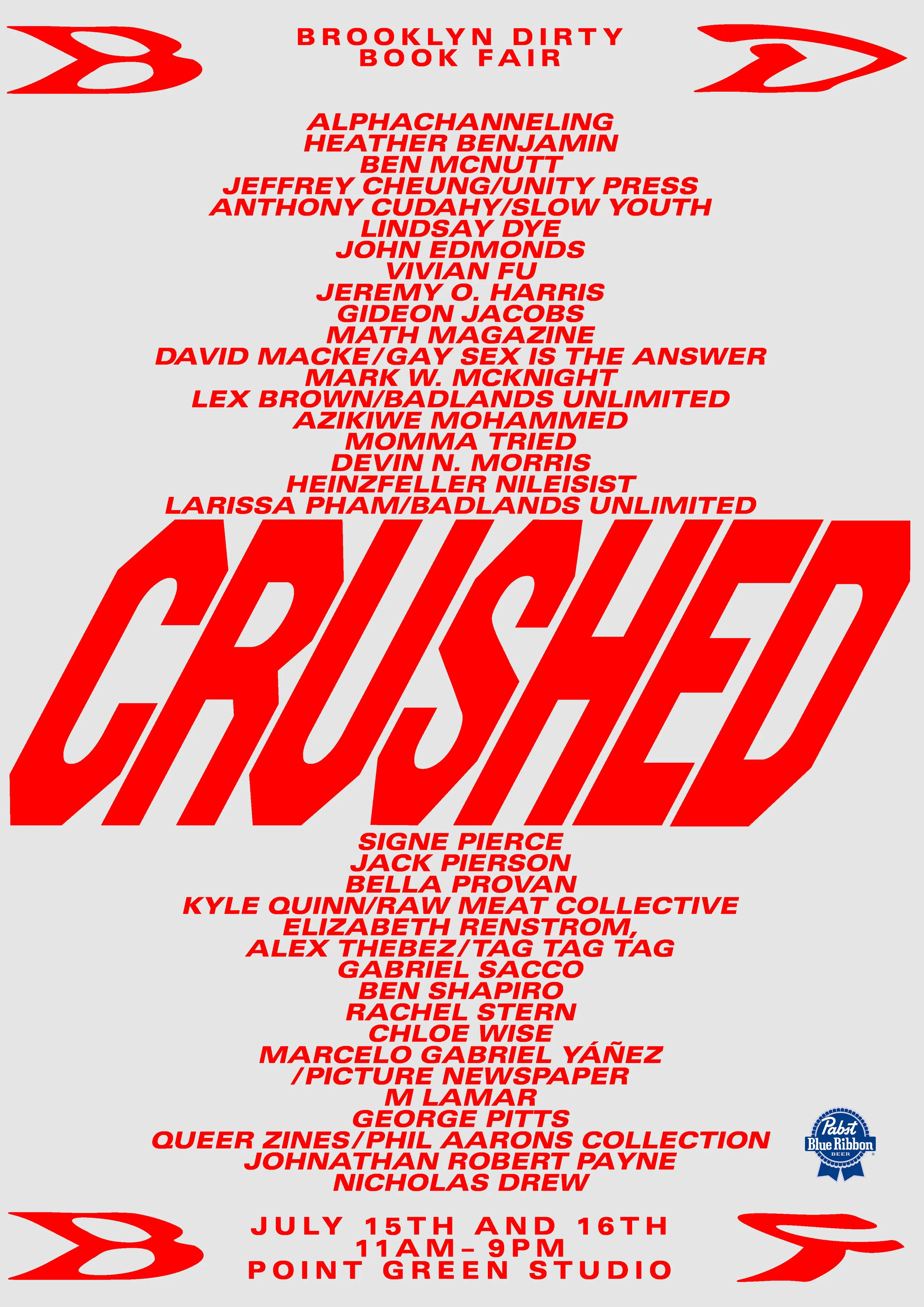 Alphachanneling, Heather Benjamin, Lex Brown/Badlands Unlimited, Jeffrey Cheung/Unity Press, Anthony Cudahy/Slow Youth, Lindsay Dye, John Edmonds, Vivian Fu, Gay Sex is the Answer, Jeremy O. Harris, Gideon Jacobs, Math Magazine, Mark W. McKnight, Ben McNutt, Azikiwe Mohammed, Momma Tried, Heinzfeller Nileisist, Larissa Pham/Badlands Unlimited, Signe Pierce, Jack Pierson, Bella Provan, Kyle Quinn/Raw Meat Collective, Elizabeth Renstrom, Alex Thebez/Tag Tag Tag, Gabriel Sacco, Ben Shapiro, Rachel Stern, Chloe Wise, Marcelo Gabriel Yáñez/Picture Newspaper