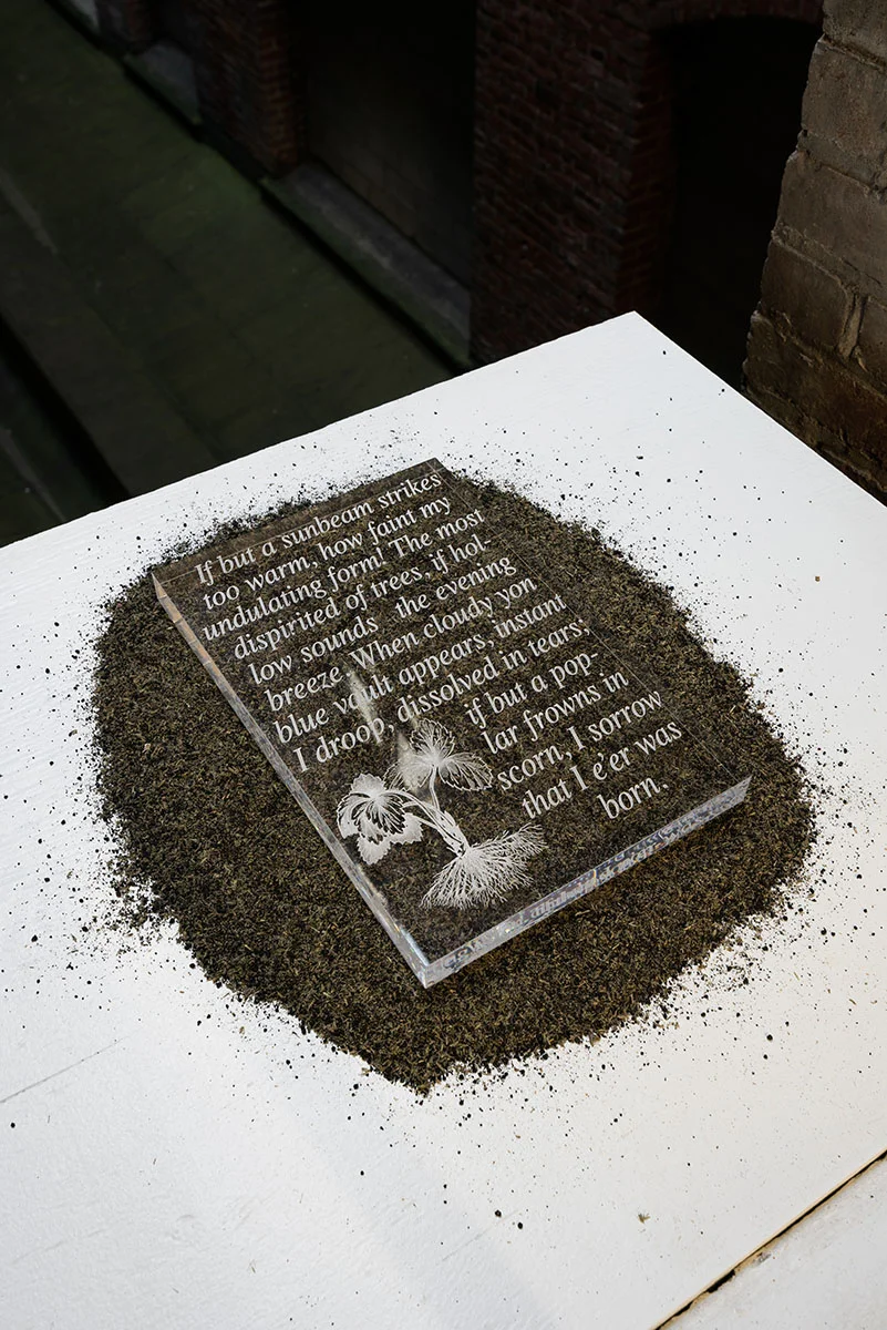 Flood: ‘If but a sunbeam strikes too warm’ is a line from a fable written in verse ‘Enchanted Plants’ by Madame Maria Henrietta Montolieu. As part of Sarah’s research she came upon this special text. Published originally in 1800 and written for Montolieu’s children it was included in this 1858 anthology The Language and Poetry of Flowers. The title sounds delicate in its poetic verse, but the vision of what occurs when a sunbeam strikes too warm conjures a destructive image. The tension between those two realities felt representative of the works in the exhibition.