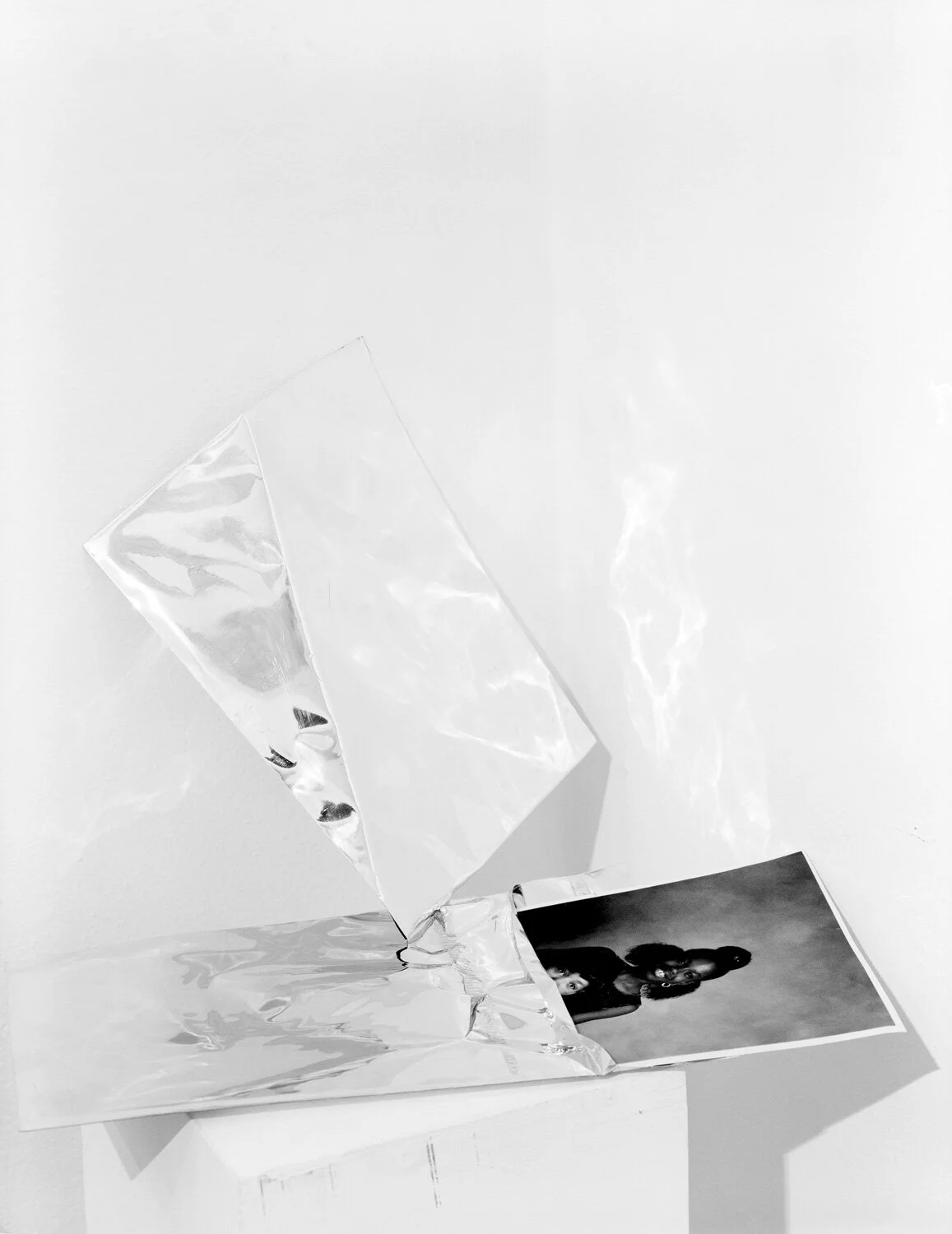 Turner constructs sculptures and montages from photographs of historical Black figures, collections of images from Ebony Magazine, and his own family archive and re-photographs them with a 4x5 camera. His images are chaotic and filled with distortion – often as subtle codes intended for viewers to absorb, process, and attempt to decipher. Photographic paper curls, folds, and shimmers with reflection and reams of light and shadow. An image of Frederick Douglass repeats itself throughout the series – at times with softened focus, at others collaged jaggedly.