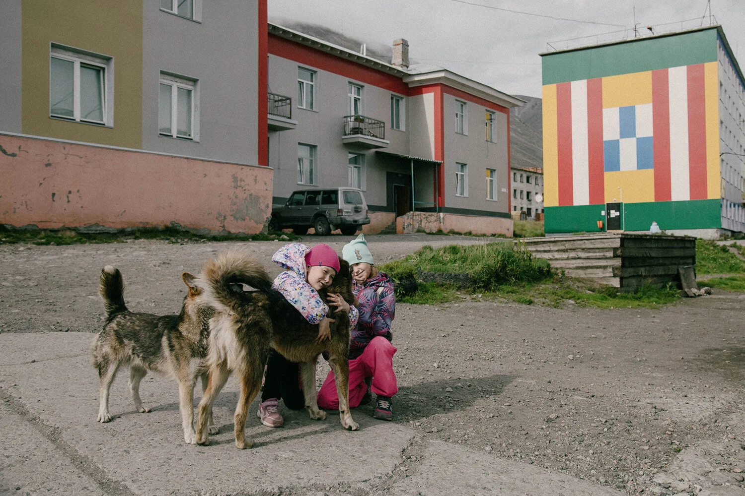 Girls in the city of Provideniya, Russia, embrace village dogs. The city itself is a mix of reclaimed concrete structures from the Soviet era that have been brightly repainted and refurbished, although many remain abandoned. © Kiliii Yuyan from the book Chukotka