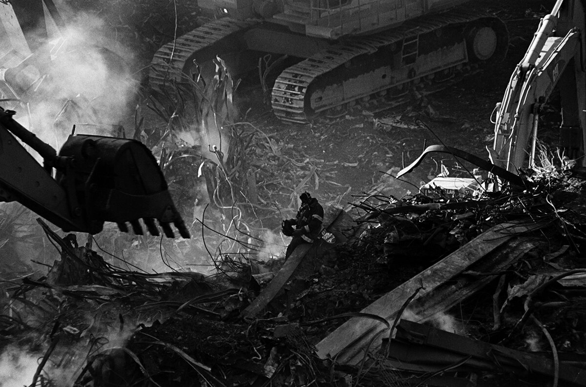 Eugene Richards, Firefighter sitting alone in the rubble, World Trade Center site, from "Stepping Through The Ashes," 2001/print 2016. Not editioned, courtesy of Eugene Richards