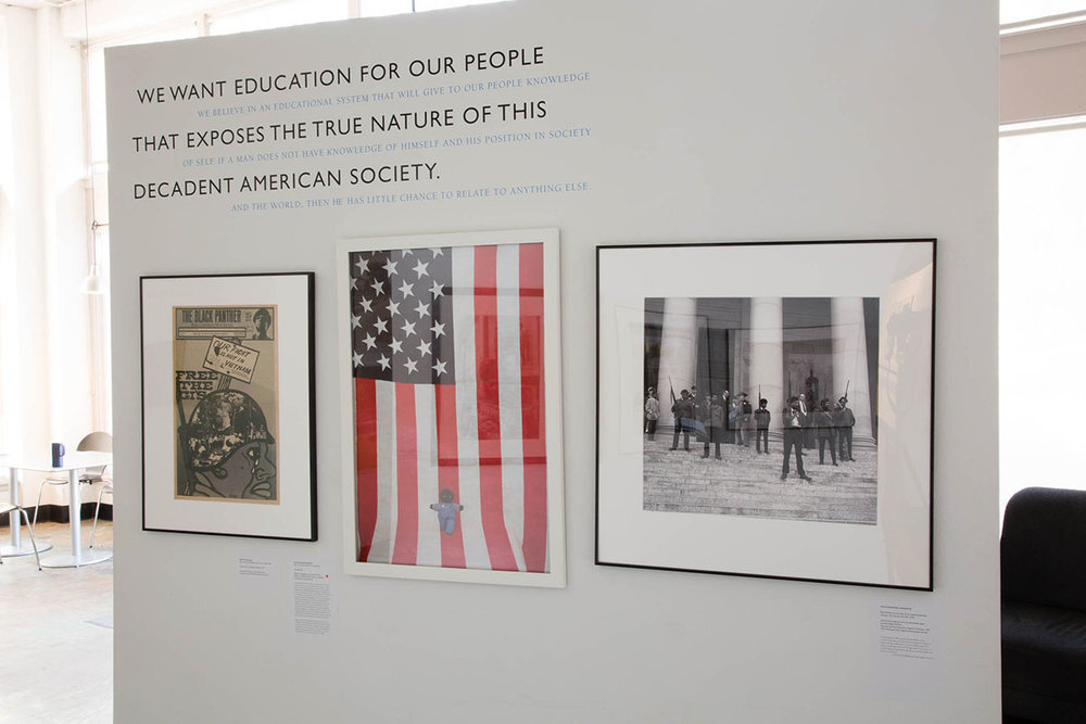 Left to right: works by Emory Douglas, Ouida Bryson, and a historical image by an unknown photographer. From the 2018 exhibition “All Power: Visual Legacies of the Black Panther Party,” curated by Michelle Dunn Marsh at Photographic Center NW. Installation photograph © Lilly Everett
