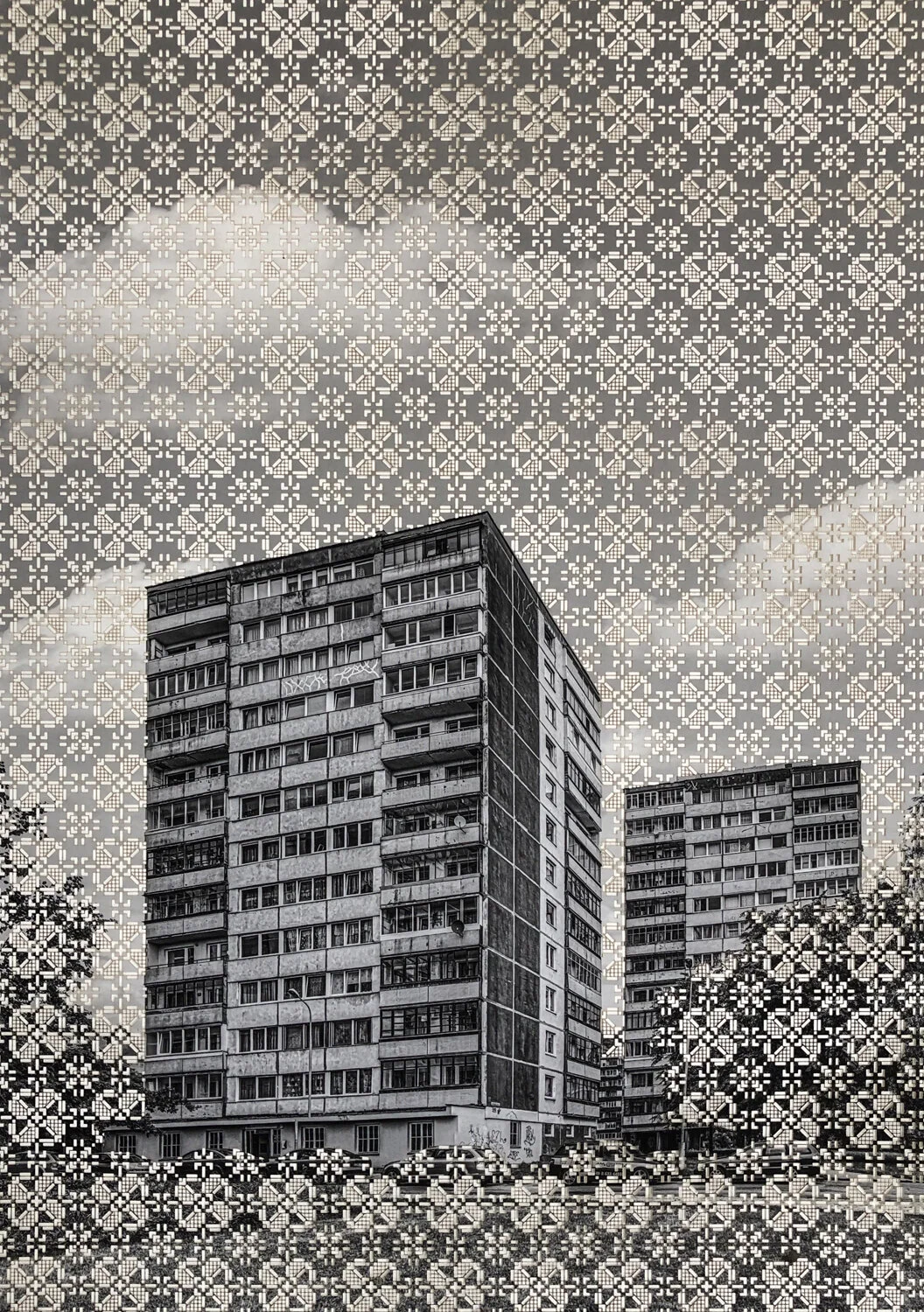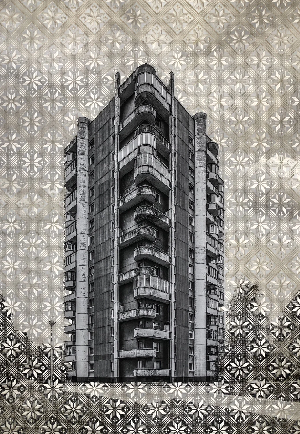 Krista Svalbonas uses intricate techniques to reference architecture and design movements as they affect and reflect culture, struggle, and totalitarian rule. Her latest series, What Remains overlays laser-cut, traditional Baltic textile designs atop typological black and white photographs of buildings in Soviet-occupied Baltic cities. For Svalbonas, this fusion of cold structures with a nod to folk art and craft is a symbolic "counterpoint to Soviet-era architecture and the memory of its totalitarian agenda."