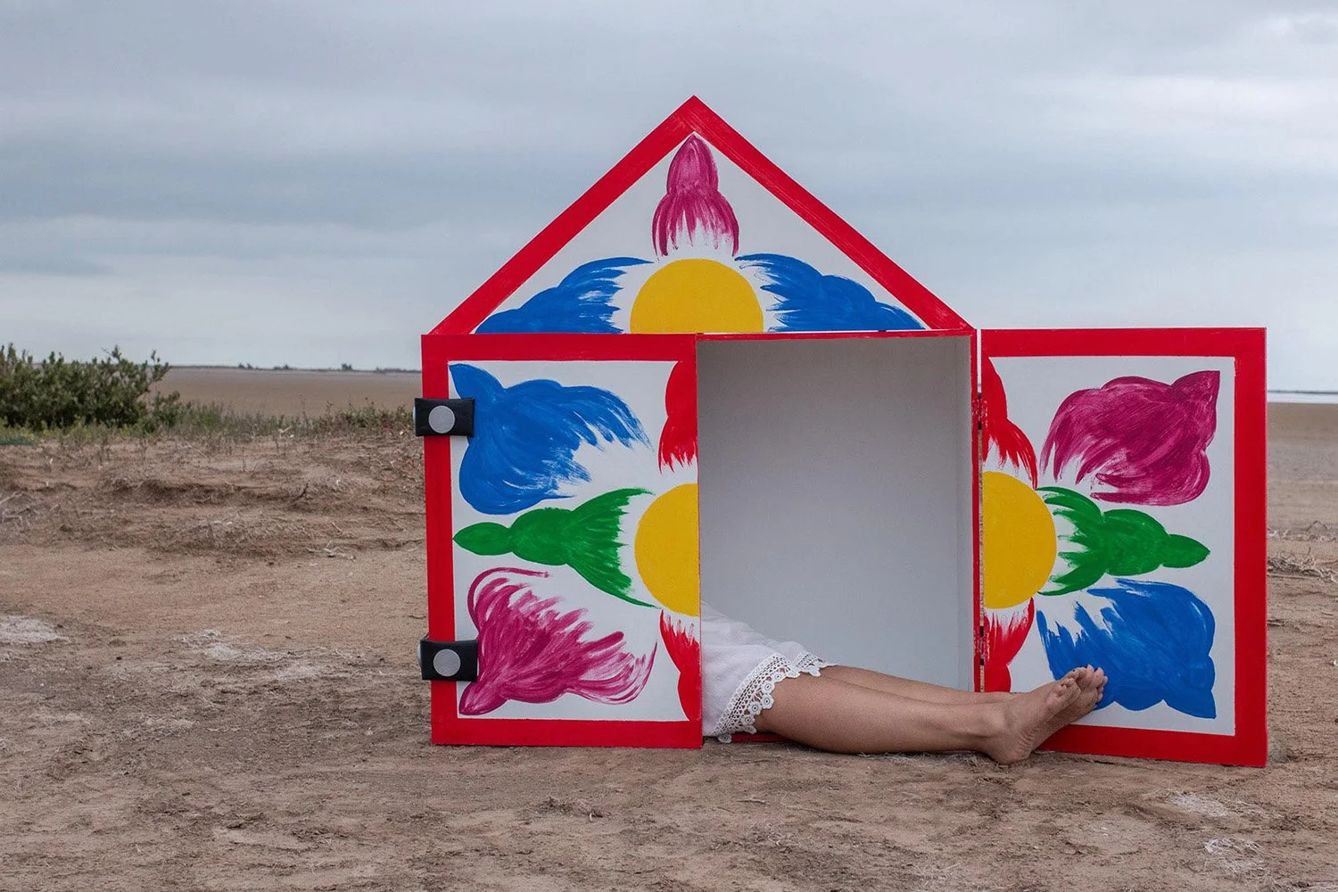 In the project's title photograph "In the Midst of My Nostalgia," for example, Lesley casts herself as the figure in Andrew Wyeth's famous painting "Christina's World," which depicts his polio-stricken neighbor on a Maine landscape - struggling with dignity despite her condition. Where Wyeth's intention was to "do justice to her extraordinary conquest for life," Lesley inserts her own struggle for hope. In place of Wyeth's dreamy field and romantic Maine barn, she casts herself looking at a border wall.