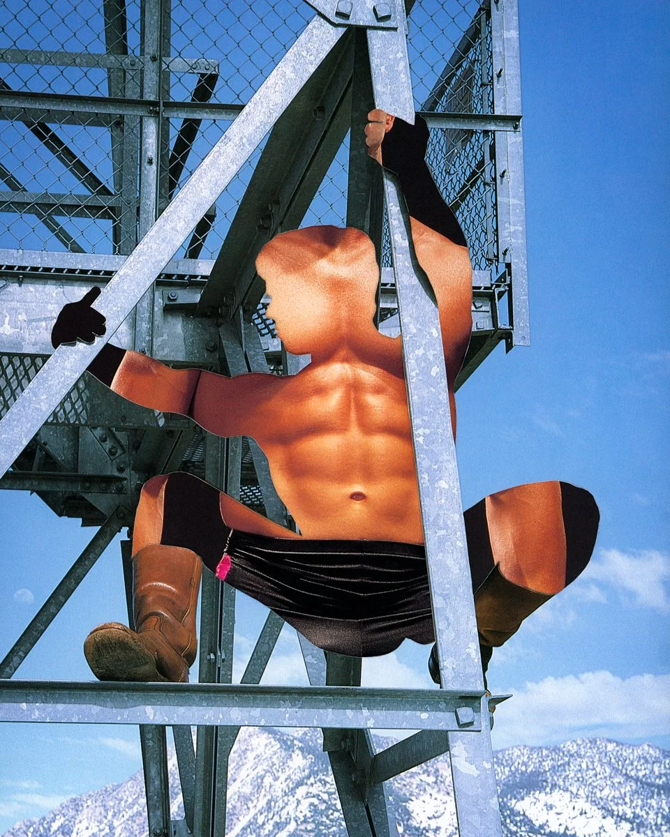 Young: When making the work, I am drawn to pairing images that have strong silhouettes in profile along with scenes that aren’t shot against a solid background. The tricky thing with these types of calendars is that many times the figure is placed directly in the middle of the frame so creating dynamic compositions can be tricky. Since I have only been combining two images into one, the way I will sometimes “cheat” my own rules is by cutting the background image and then rearranging it so it appears that there may be more than one figure in the background. You can see this in the work Leather on Leather.