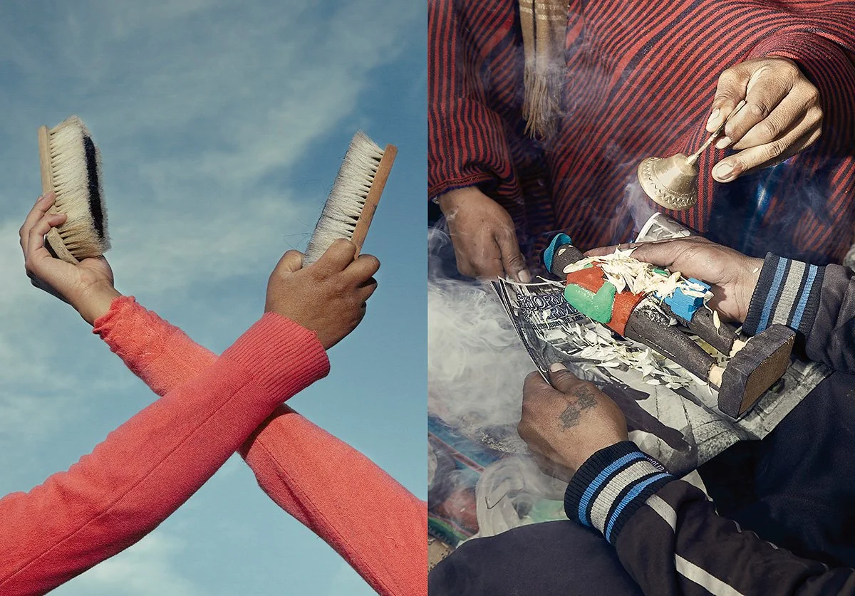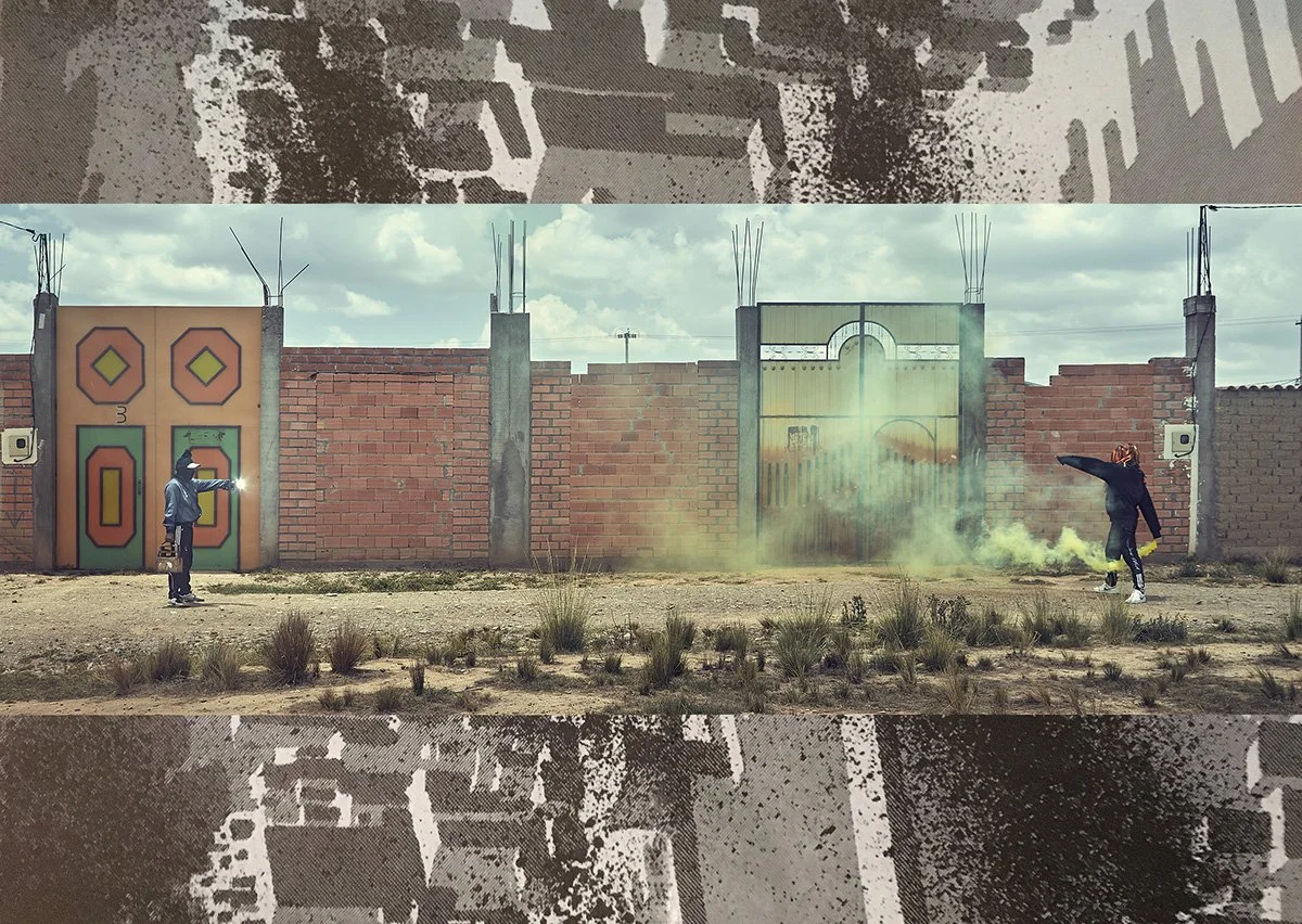 Then, all together, we built a collage storyboard on the everyday life of ‘Los Heroes del Brillo’—the ‘Shine Heroes’. This inspired the narrative for the final photobook. The pictures were taken during photoshoots in the cities of El Alto and La Paz, where we drove all over town in a minibus with the shoe shiners as lead actors. In Bolivia there is a local architectural style called ‘cholets,’ based on fantastical buildings inspired by the Tiahuanaco ceramics. These provided the perfect scenography to create a fantasy city we named ‘Brillolandia’.